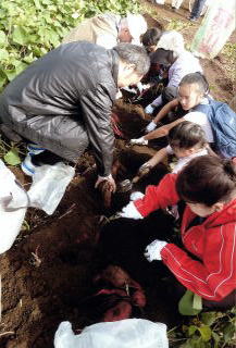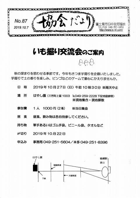 例年実施している芋掘り交流会が10月27日の日曜日に三芳町林農園で開催された.当日は,暑からず,寒からずの秋の気配濃厚なやや曇り空のもと,約20名の参加を得て実施した.前々日は,台風21号により関東地域に大雨を降らせ,各地に河川の氾濫被害が続出した.当日三々五々,10時半に参加者一同,林農園に集合し,1人2株のさつま芋の掘り起こしに挑戦した.雨上がりとはいえ,結構硬くしまった土中に埋まるさつま芋を途中で折らないように慎重に土を掻き分け掘り出す.奮闘甲斐なく僅か1個の芋しか付いてないこともあるが,大きな芋が群がるように付いているものもあり,悲喜こもごもであった.芋掘りの後,持参の弁当を頬張り,そして会員寄贈の景品をターゲットに,お待ちかねのビンゴゲームに興じ.和やかな語らいあり,歳忘れの楽しい芋掘り交流会の1日であった.