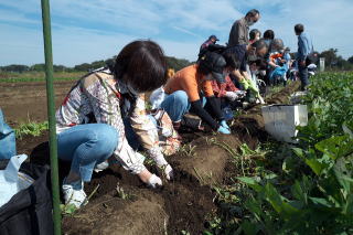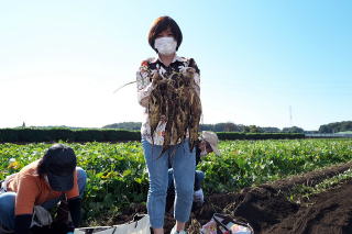まさに芋ほり日和となった一〇月二三日(日)、恒例の芋ほり交流会が三年ぶりに開催されました。富士見市に隣接する三芳町は川越芋の名産地。「はやし園」には朝から続々と観光客が集まってきます。富士見市日中の一団も手続きを済ませて、いざ芋畑へ。短い時間でしたが、ビニール袋一杯の“成果”に、皆さん満足の様子でした。