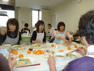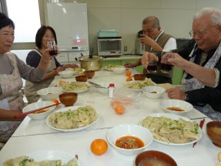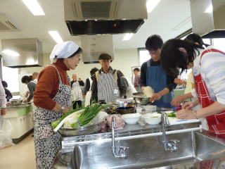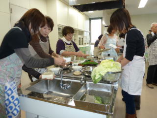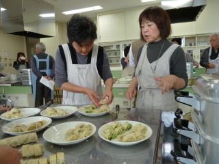 (12)沸騰し、蒸気が多く出てから10分経つと野菜のみのものが、15分経つと肉が入ったものが完成します。取り出して、包丁で適当な大きさに切り分けます。 |