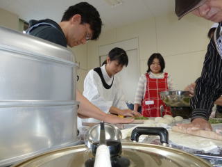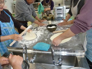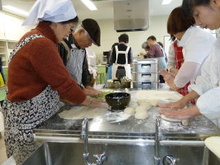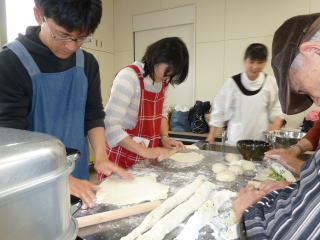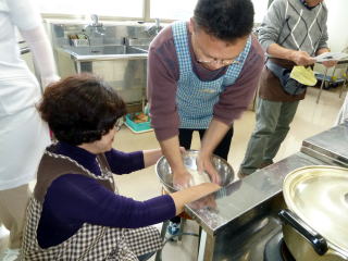 (2)小麦粉1kgに80度程度のお湯を少しずつ加えながら、混ぜ、耳たぶくらいの柔らかさに捏ねます。水を多く加えすぎないように注意します。残った小麦粉は打ち粉として利用します。その後、ラップまたは濡れタオルでふたをし、寝かせます。 |