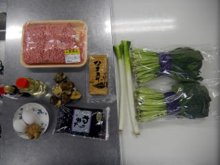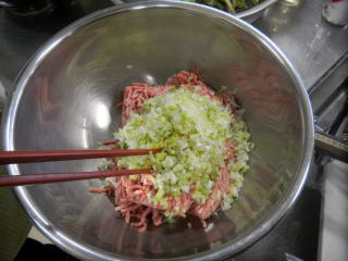 (2) みじん切りにした長葱、生姜(半分)を挽肉に加え、砂糖、塩、みりんを加え、混ぜます。
