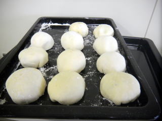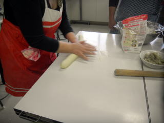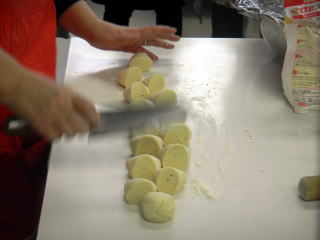 (1) 寝かせた生地をこね、棒状に伸ばして、切り分けます。1kg小麦粉できた生地にあたり30個程度が目安です。