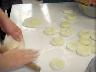 麺棒で切り分けた生地を直径8cm位の円形に伸ばして皮を作ります。